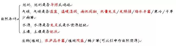 自然因素:1.土地(地形、土壤) 2.气候(光照、热量、降水、温差) 3.水源(灌溉水源)