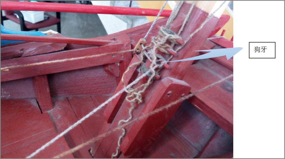 虎齿:艏面头犁壁顶端也叫“崁巾”,其上头的竖立的两三根木柄,规范锚绳的滑动位置,泉州北边叫羊角,其它也称“麓角”的;