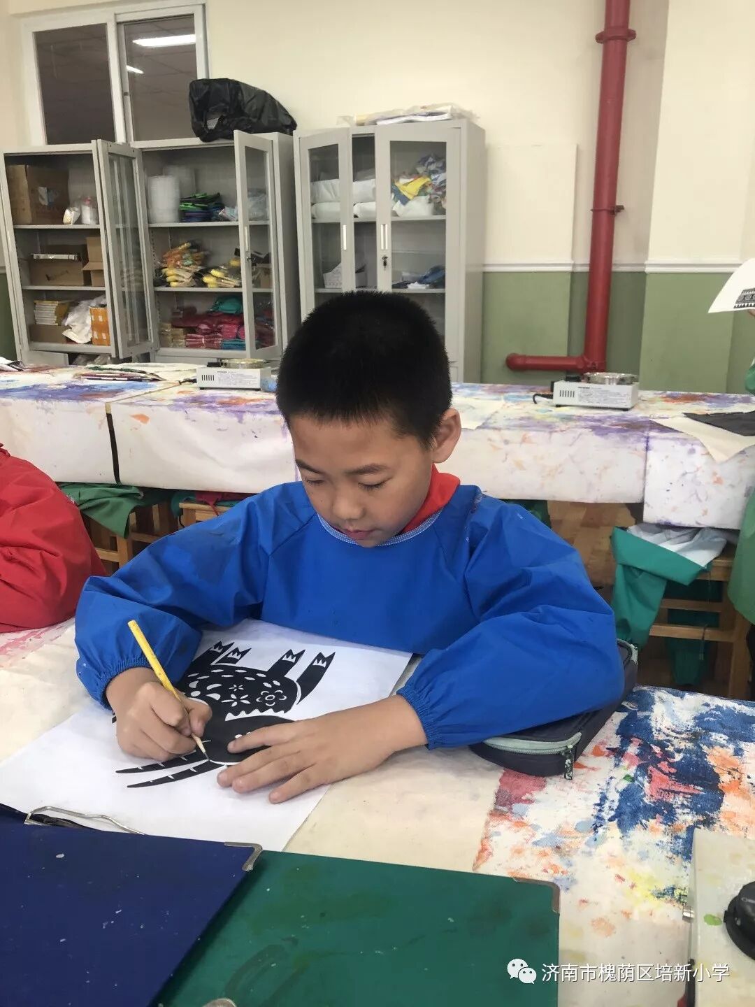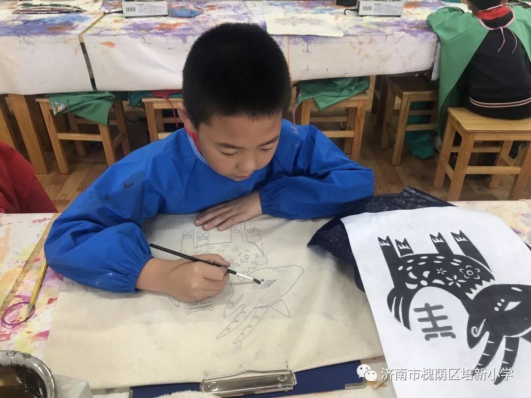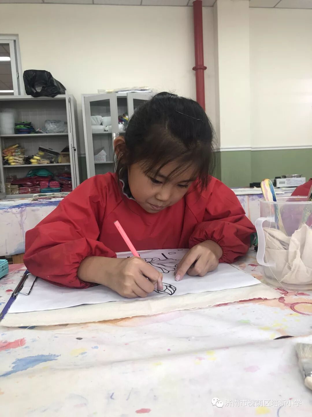 了解了蜡染的知识,就要亲自动手去试一试。队员们穿上小围裙,一个个好像要干一番大事业一样,围坐在蜡锅旁。按照老师的要求,先从第一步画图开始,一个个仔仔细细、认认真真。