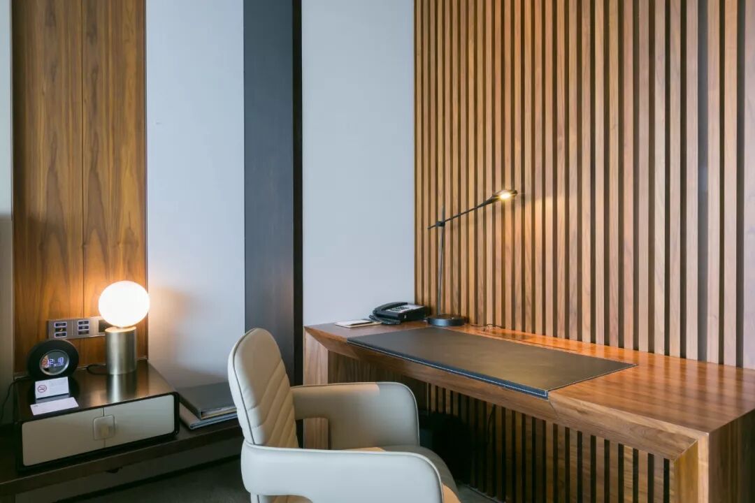 原木色与灰色为主基调色,从高雅灰皮质办公椅、床头柜、床头背景墙,到深色的皮质写字台垫板,沉稳而高贵。客房控制面板操作简单,并配备JBL的蓝牙闹钟音箱。