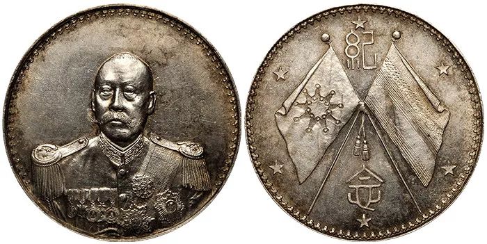 总述:该币出色的图样,搭配了洪宪帝军装高缨正面及胸像。人们原先认为这枚硬币是为了纪念1916年袁世凯登基而作,但最新研究表明这些硬币可能是袁世凯死后所发行的准纪念币或非流通币。