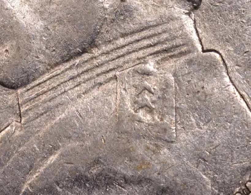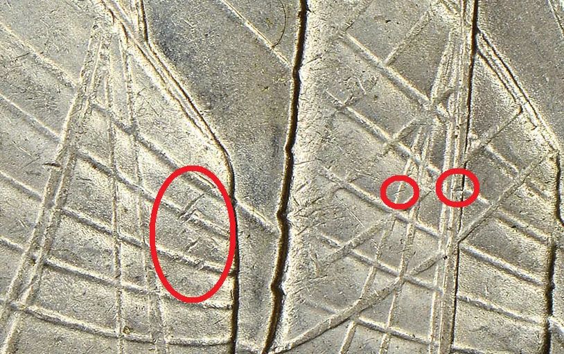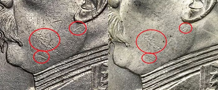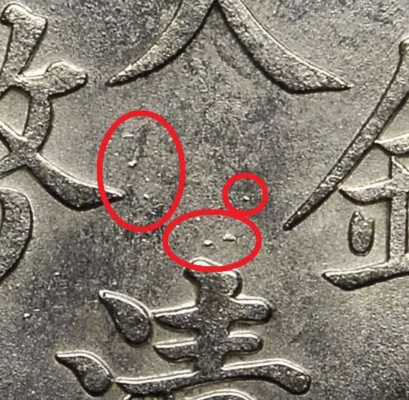 提示:具有欺骗性的假币由翻模法制成,并且可以看到同模伤。寻找与周围币面呈现出相同纹理和币表颜色的阴伤。