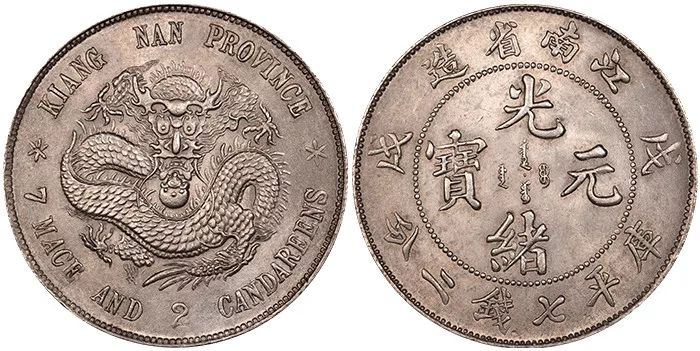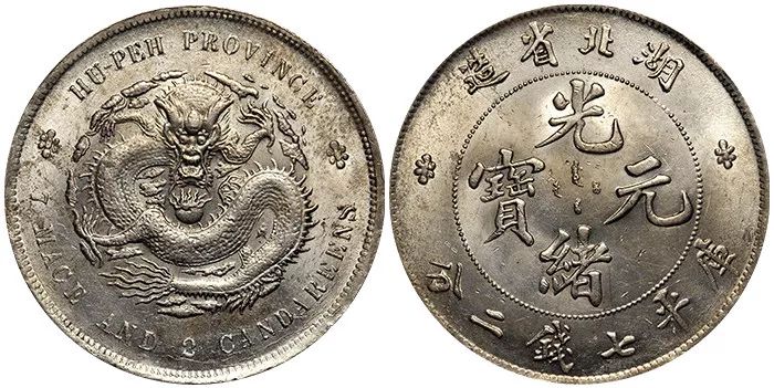 总述:这枚一两面值,大小与七钱二分银币类似的湖北省硬币是在光绪三十年发行的,主要用于地方流通。它有非常独特的双龙图案,这种图案很少出现在铸币上。和先前湖北省发行的钱币一样,这枚硬币在流通上并没有被人们所接受,因而停产。这枚硬币仅发行了一年,热门而且贵重。
