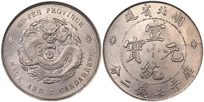 总述:此币与同样出现在本列表上的(1895-1907)湖北省造光绪元宝库平七钱二分银币(L&M-182)非常相似,其正面铭文以“宣统”字样代替“光绪”。