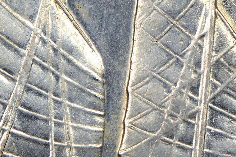提示:很多假币都是采用翻模法铸造的,高点处细节较弱、较模糊。这是因为铸造假币的模具是使用弱打的真币作为模板制造的。虽然假币的高点处也有均匀一致的光泽,仿佛全打一般,但细节仍有遗漏或是不够清晰。