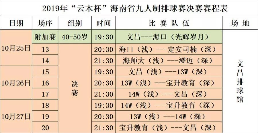 经过三天的激烈精彩角逐,2019年云木杯海南省九人制排球赛决赛将于25日晚7点半在文昌排球馆开打。今晚将有三场比赛。首先进行的是一场40—50岁的附加赛,由文昌队对阵海口队。随后的两场正式比赛,将由海口队、海师大队分别与B组的定安司楠队、澄迈队争夺四强剩下的两个名额。