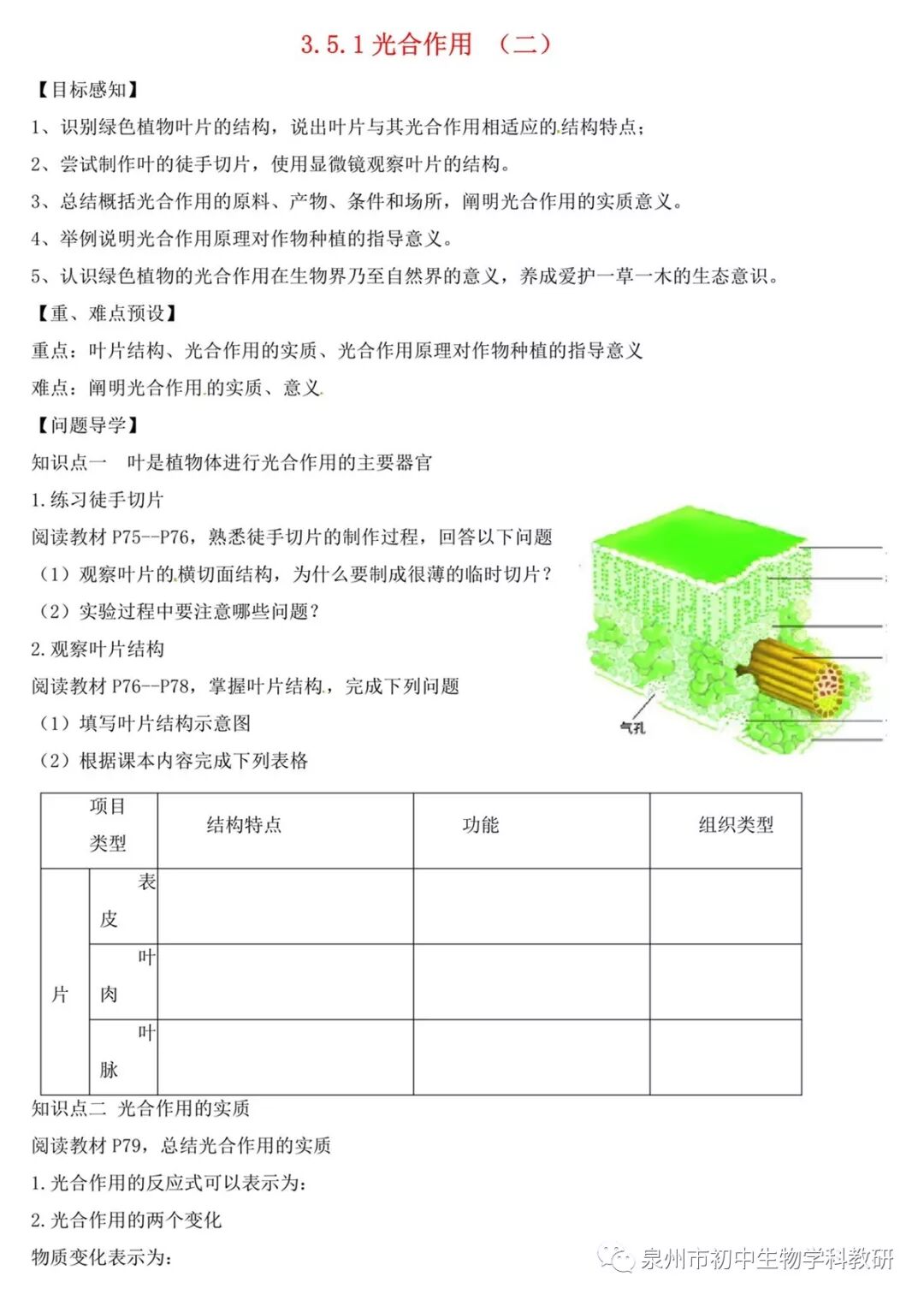 重点:1、识别绿色植物叶片的结构、说出叶片与光合作用相适应的结构特点。