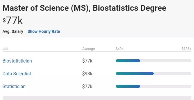 生物统计在各领域的应用广泛,在美国就业形势良好。以下是美国著名薪酬网站公布生物统计硕士项目的平均薪资情况:
