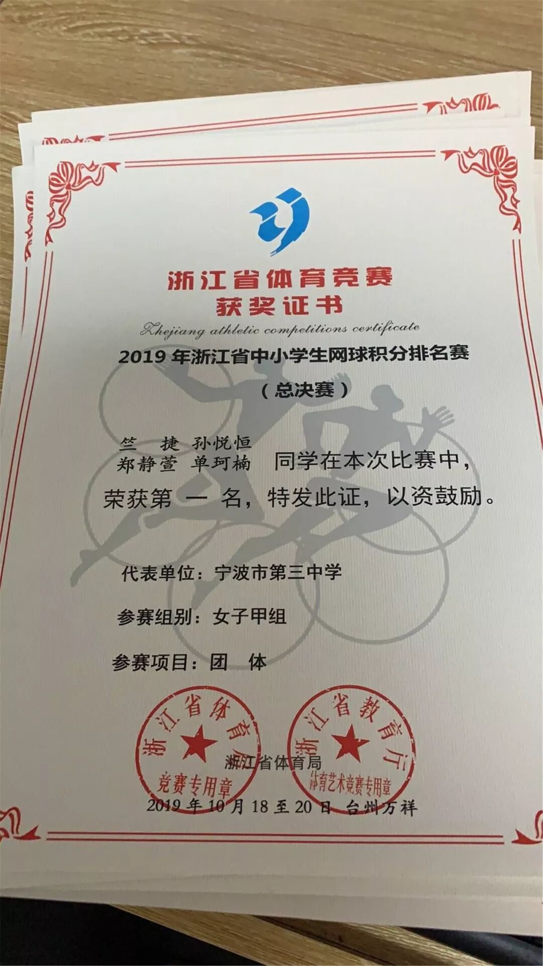10月18—20日,为期3天的2019年浙江省中小学生网球积分总决赛(临海站)落下帷幕,宁波三中网球队表现优异,斩获2金1铜。竺捷荣获女子甲组双打第一,郑静萱 、单珂楠荣获女子甲组双打第三,她们奋力拼搏,在团体比赛中又取得第一名的好成绩!一份耕耘,一份收获,台前的闪耀永远是默默无闻的付出。祝贺运动员们,你们用汗水、斗志谱写了自己最美丽的青春!