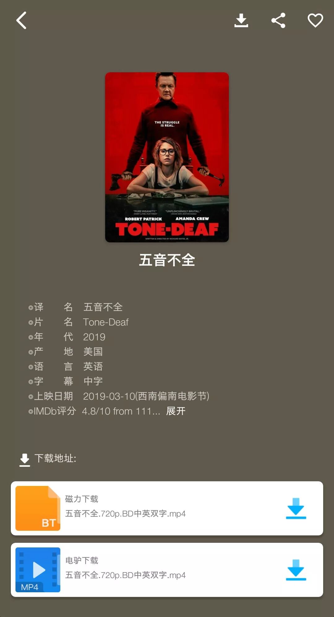 打开影片,可以看到影片的一些截图和影片介绍,然后支持磁力下载和电驴下载,软件内置下载工具,无需调用迅雷等第三方下载工具。