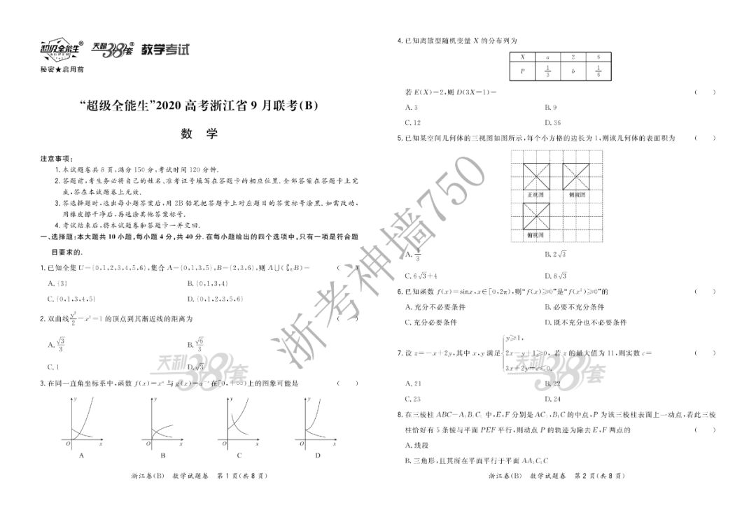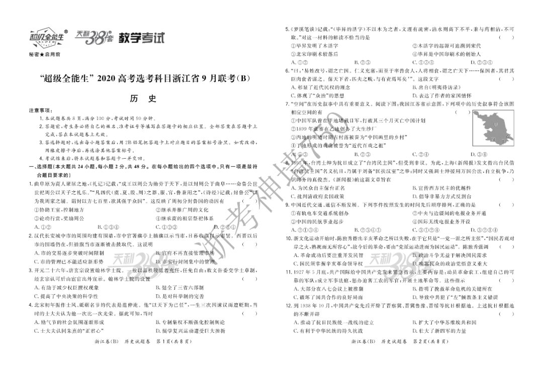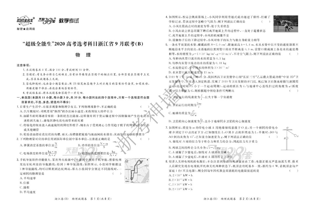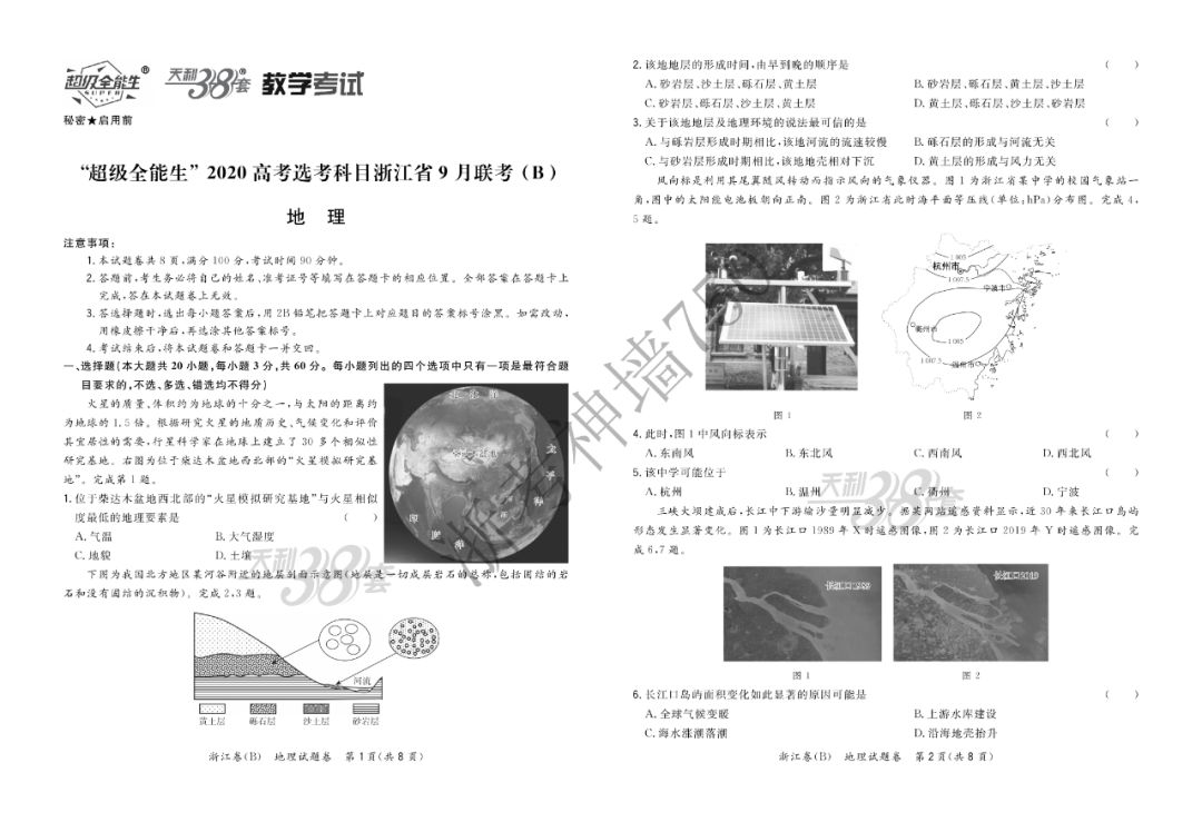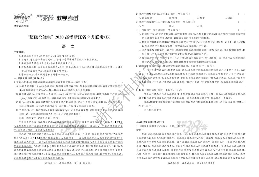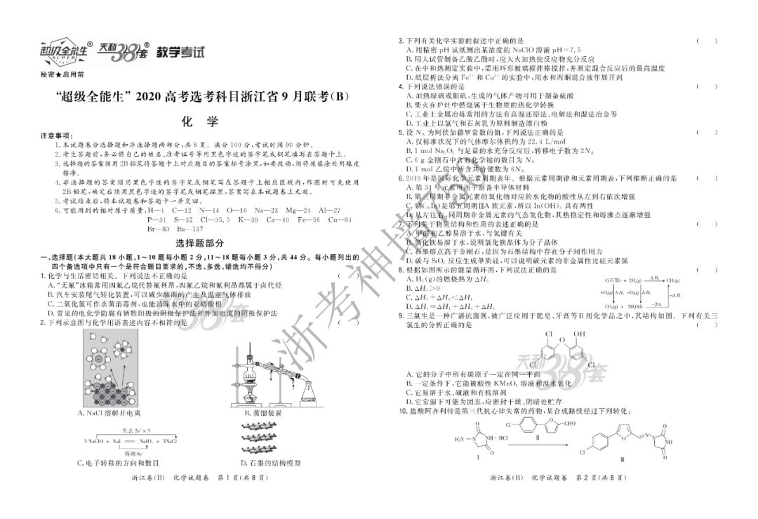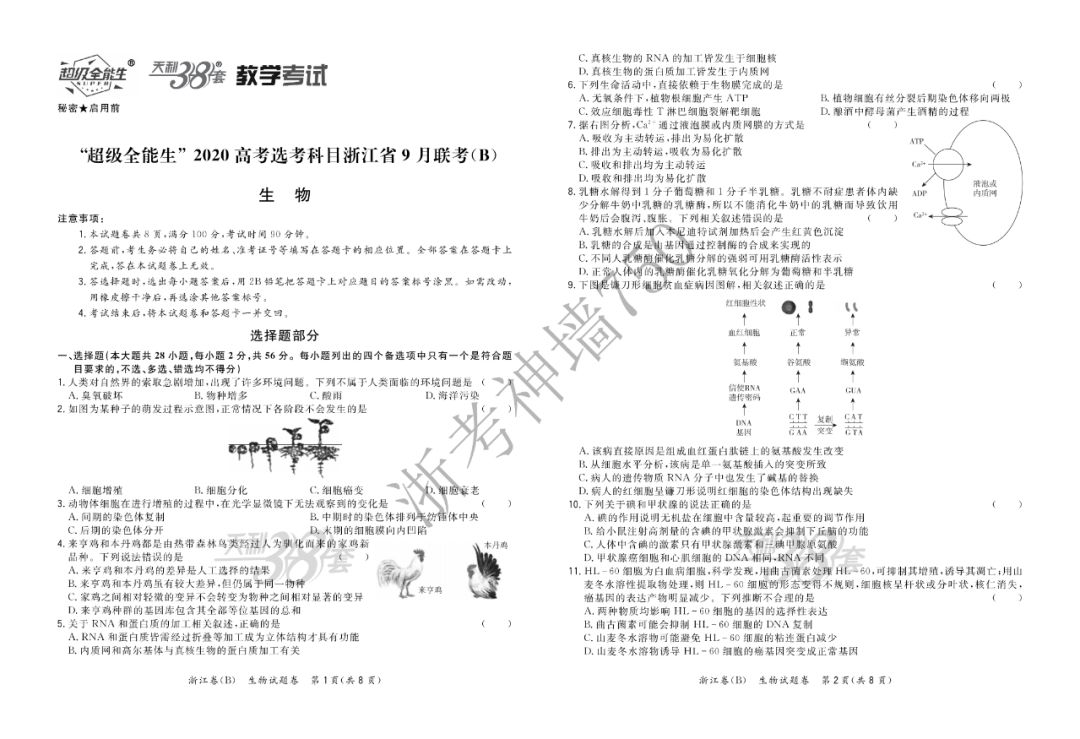 【完整10科】超级全能生2020高考浙江省9月联考(B)