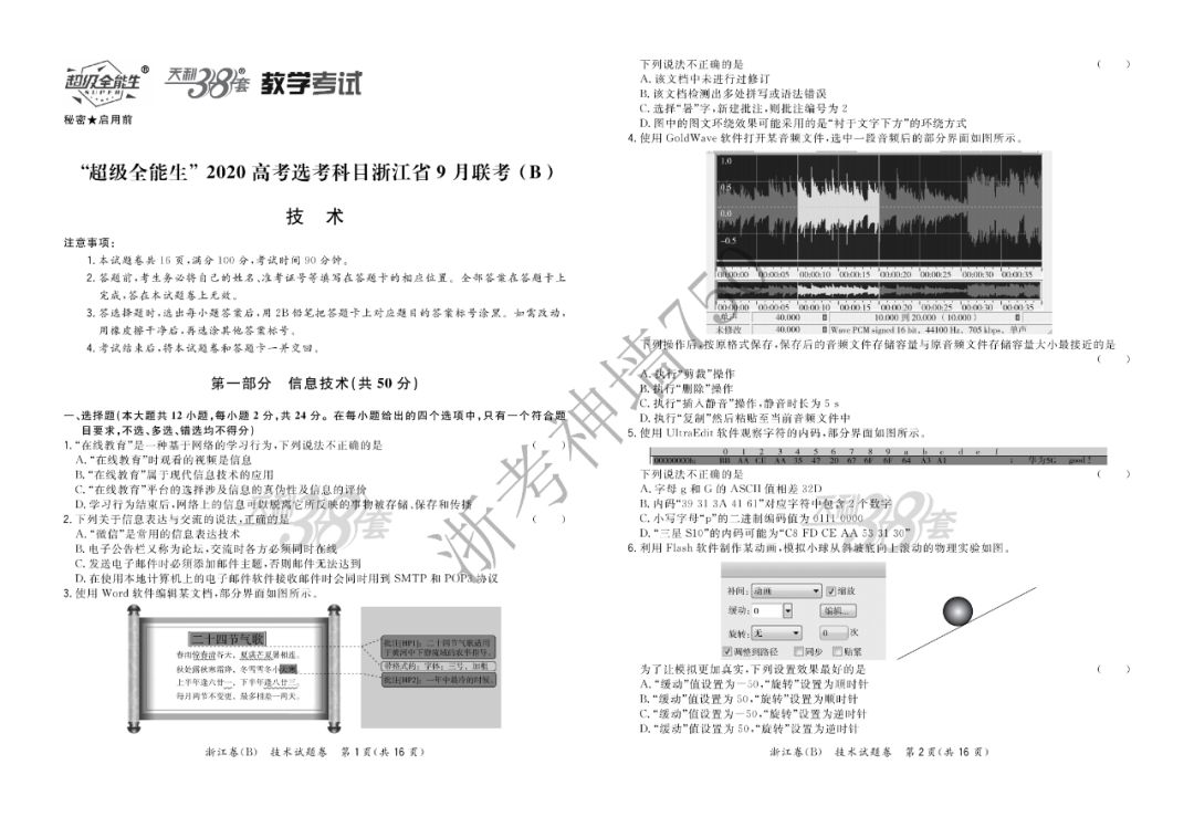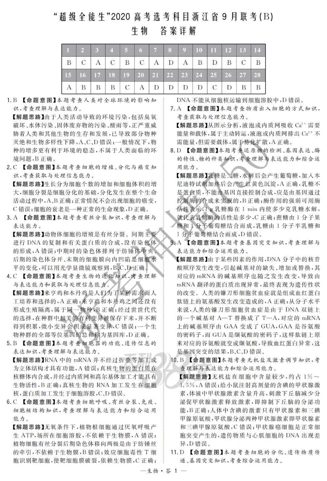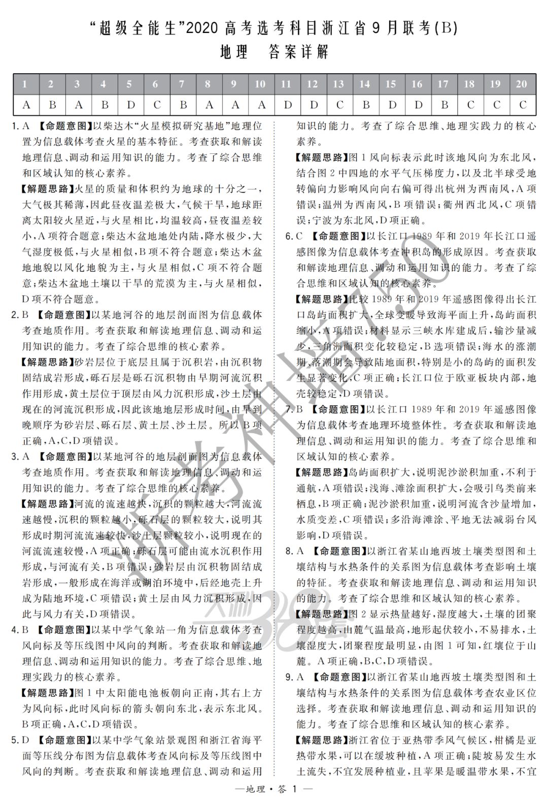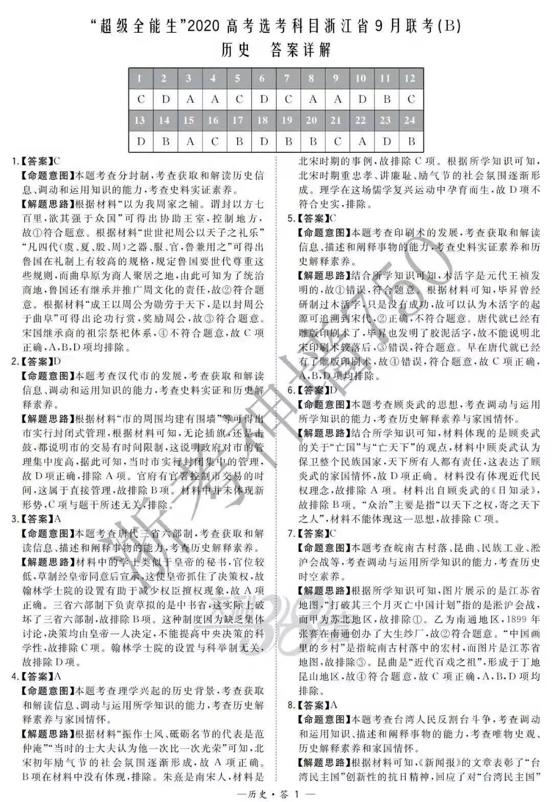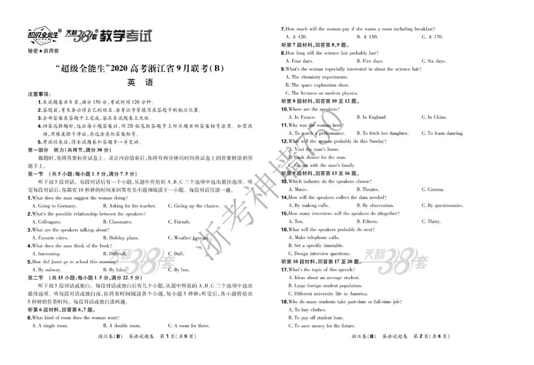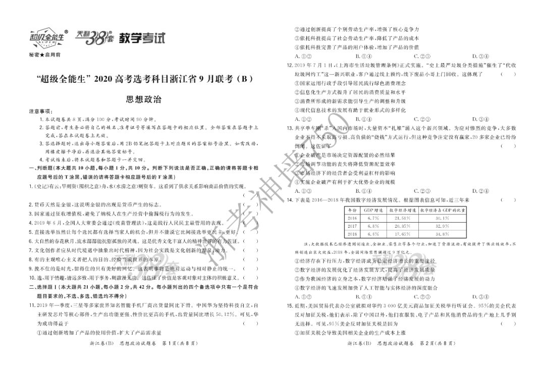 【完整10科】超级全能生2020高考浙江省9月联考(B)