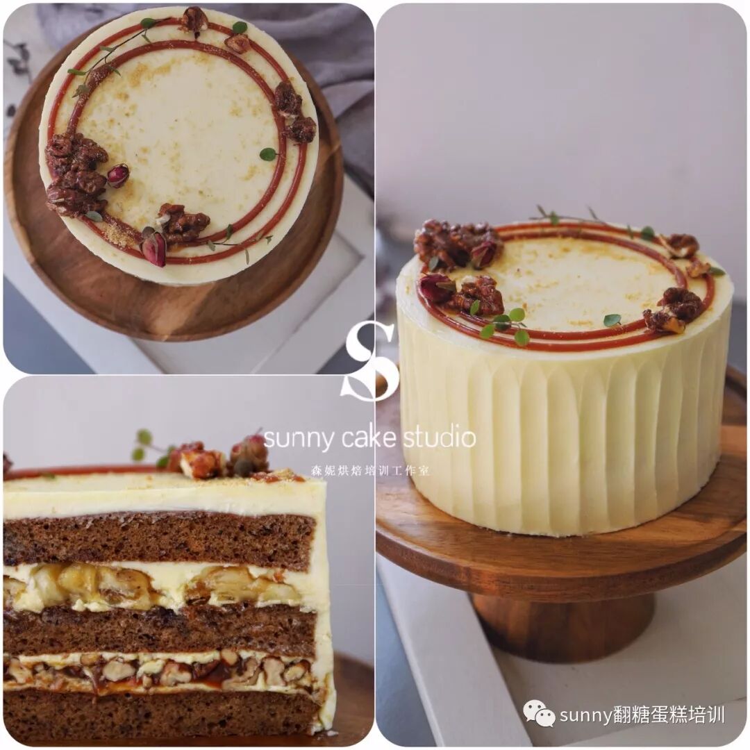 4、香蕉核桃磅蛋糕:香蕉磅蛋糕胚的制作、琥珀核桃的制作、意式奶油霜的制作、蛋糕夹心技巧、整体蛋糕装饰