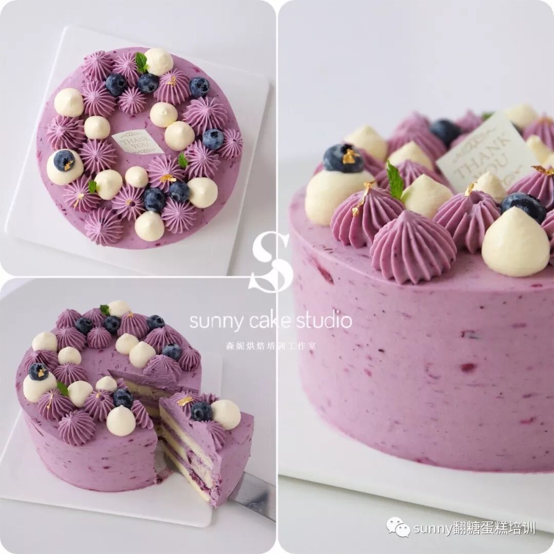 7、蓝莓奶油蛋糕:原味戚风蛋糕制作、蓝莓奶油的调制、整体装饰