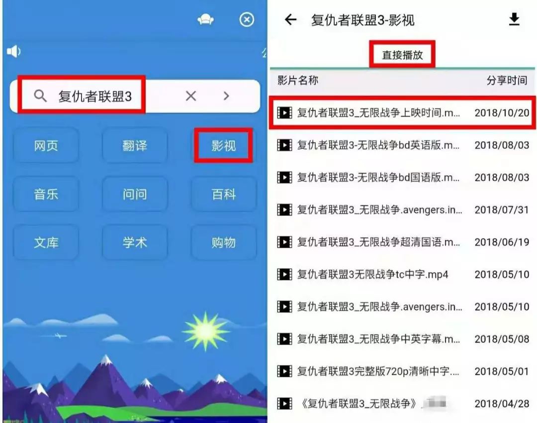 在搜索框中输入“电影名”,点击“影视”,看到结果后,选择电影文件,即可在线播放,非常方便~