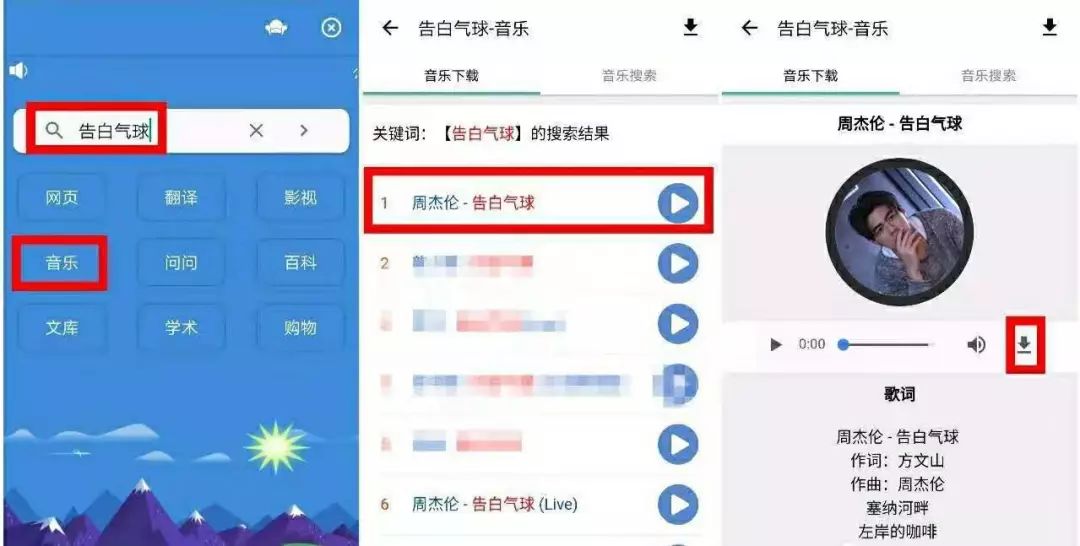 输入想要查找的“歌曲名”,点击“音乐”,搜索结果出来之后,选择想要的歌曲进行播放,还可以在播放页点击“下载”按钮,免费下载到手机。