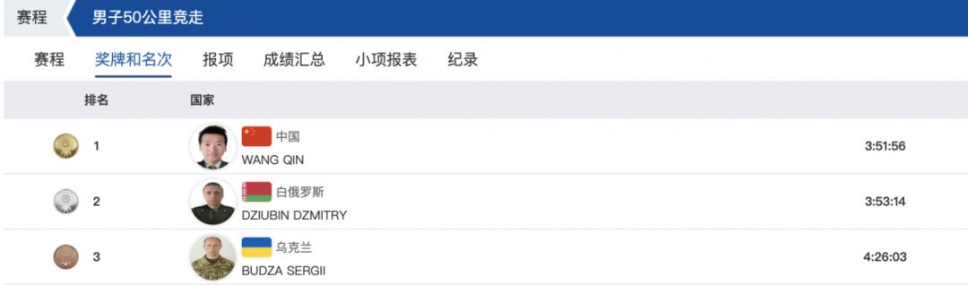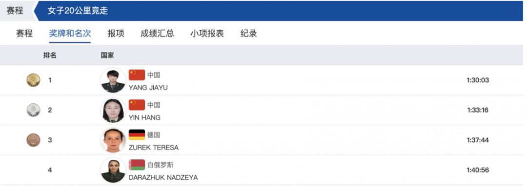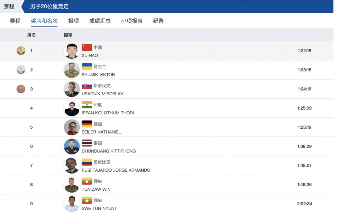 上午比赛单元中,中国选手包揽了竞走三个项目的冠军。杨家玉和尹航包揽女子20公里冠亚军,成绩分别为1小时30分03秒和1小时33分16秒;许皓获得男子20公里竞走冠军,成绩为1小时22分18秒;男子50公里竞走比赛中,王钦以3小时51分56秒夺冠。