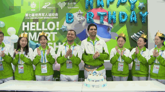 军运会媒体服务中心活动执行助理 常乐:我们这个活动为的是让忙碌的中外媒体记者能够在军运会留下美好的回忆,特意准备的。所以我们统计同一天过生日的记者,这个活动在军运会期间每天都会有,最多一天有20多个人过生日,还有外国记者一起。因为大家忙,所以有的没办法来。