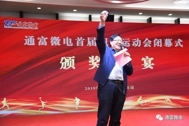 闭幕式上,通富微电董事长石明达代表集团公司向取得优异成绩的代表队表示祝贺,向顽强拼搏的全体运动员和恪尽职守的工作人员表示慰问。他高度评价了各代表队顽强拼搏、争创一流的奋斗精神,赞赏他们用体育竞技的方式热情呈现出的“顽强拼搏、奋勇争先”的精神风貌,给企业注入了新的精神动力,激励全体员工为实现我们的“通富梦”而竭尽全力。