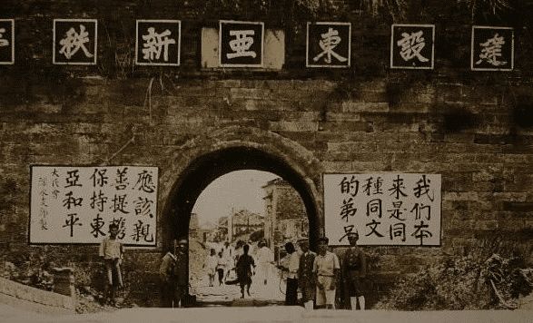 墙上的牌子上写着:我们是同类兄弟,应该善待维护东亚的和平。日本侵略中国,在焚烧、杀人、抢劫的同时,贴出了这样的告示,真让人生气。