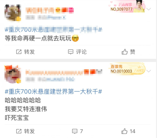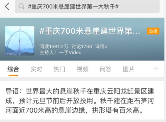 悬崖秋千 秋千位于云端廊桥旁,由一个门型支架和几根钢管形成支撑,钢管被牢牢固定在悬崖内防止门型支架移位。秋千高度是12米,角度摆出去大概85度,从秋千出发到停止有10多分钟。
