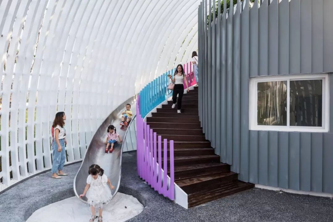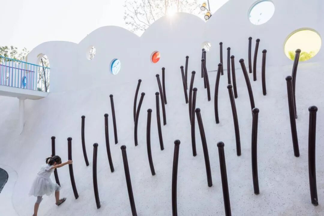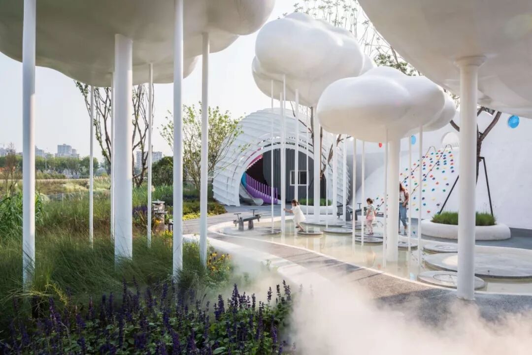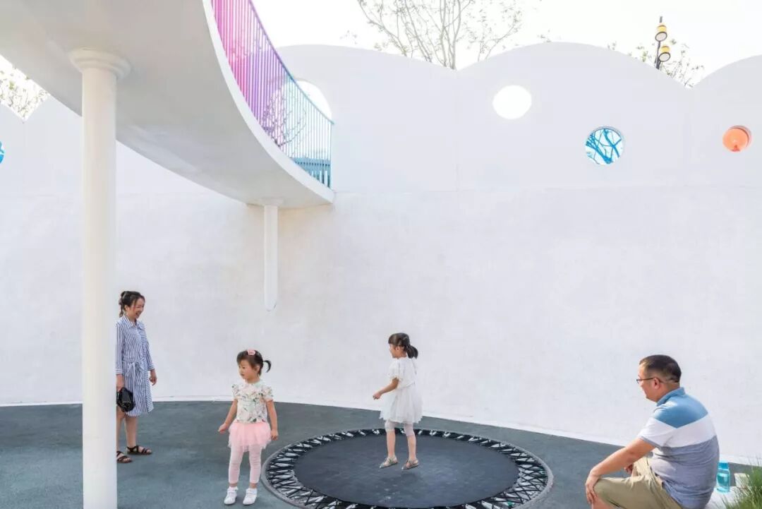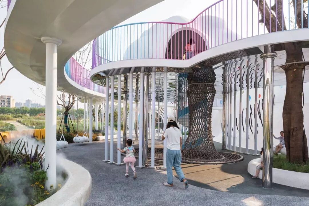 考虑到贯穿云朵主题,结合攀爬树屋,我们打造了具有场地特色的云朵树屋,大人与孩子们可以通过楼梯及攀爬网,到达二层树屋, 增加场地趣味性及探险性。