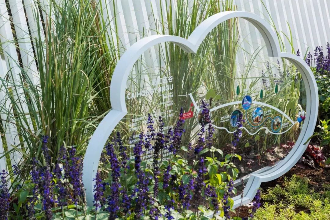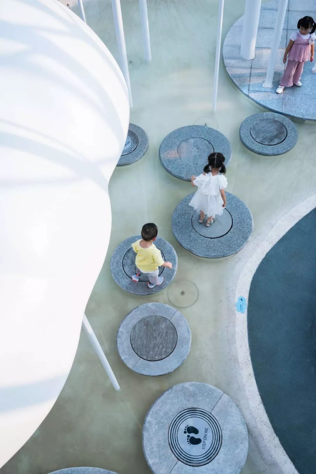 雨水下到地面汇聚成小溪。小孩子踩在汀步上,右侧的圆形水景相应的有涌泉喷出。