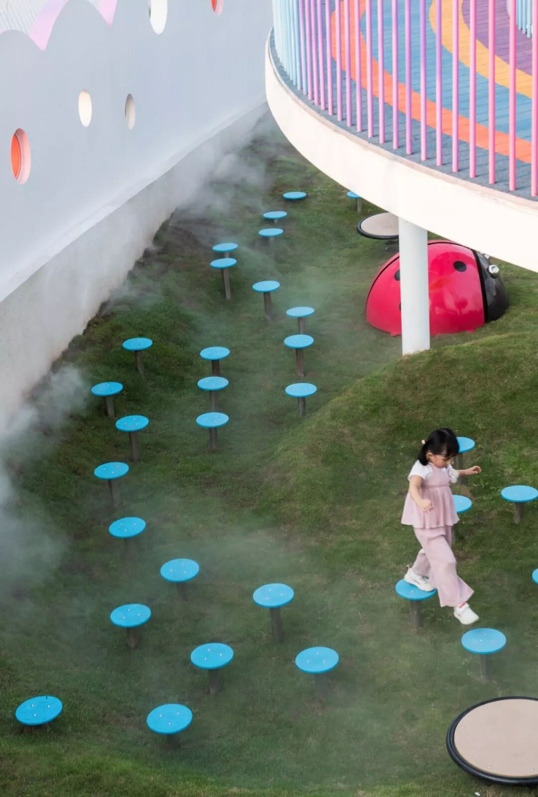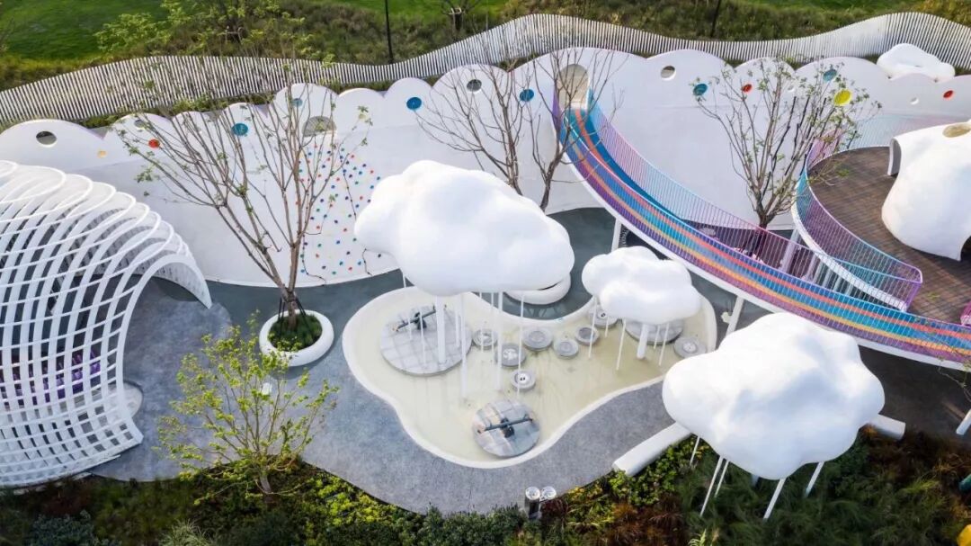 森林休憩园地通过起伏的地形表现森林地貌的多样性,结合七彩云朵 坐凳、云朵木桩、海绵蹦床,打造云间跳跃的梦幻休闲感。