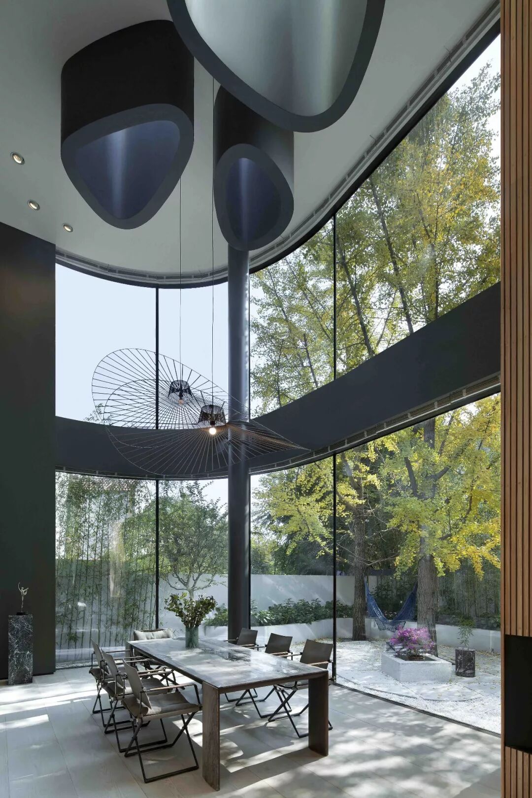 江一燕的两层独栋别墅有一个巨大的弧形落地窗,房子外部景观做了大部分留白,减少了复杂的装饰,只用了黑色线条做点缀。