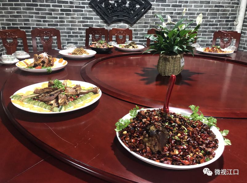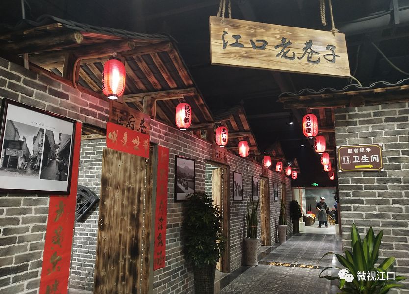 餐厅内设一个个小包间,每个包间都用我们江口人最熟悉的地名命名。走廊、各餐厅角落都挂着充满年代感的壁画。
