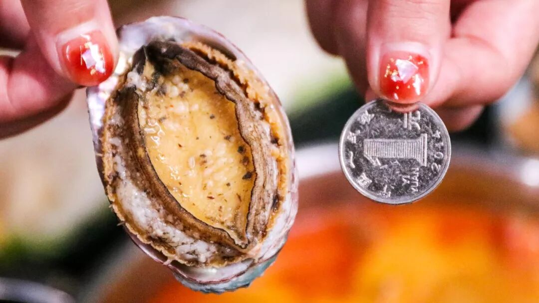 个头敲大的鲍鱼和一元硬币比起来,你就知道它有多实在了!你看这个鲍鱼,它又大又鲜...小贝和朋友分享,一口下去,饱腹感满满~