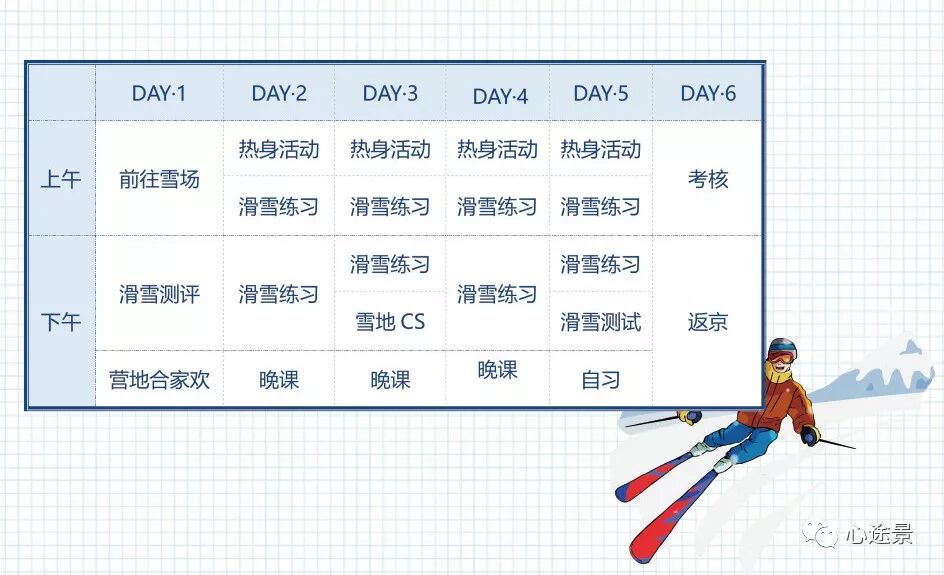 我们会有入营考核,有滑雪基础的孩子经过考核后按照课程体系进行分班。