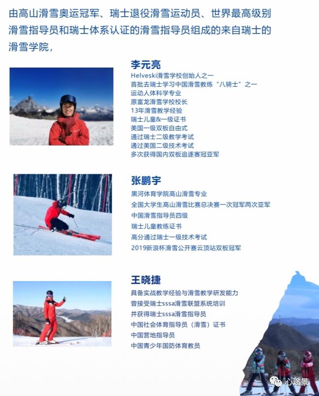 由高山滑雪奥运冠军、瑞士退役滑雪运动员、世界最高级别滑雪指导员和瑞士体系认证的滑雪指导员组成的来自瑞士的滑雪学院,包含了提供瑞士品质服务的大众滑雪学校和高水平的竞技滑雪学校。