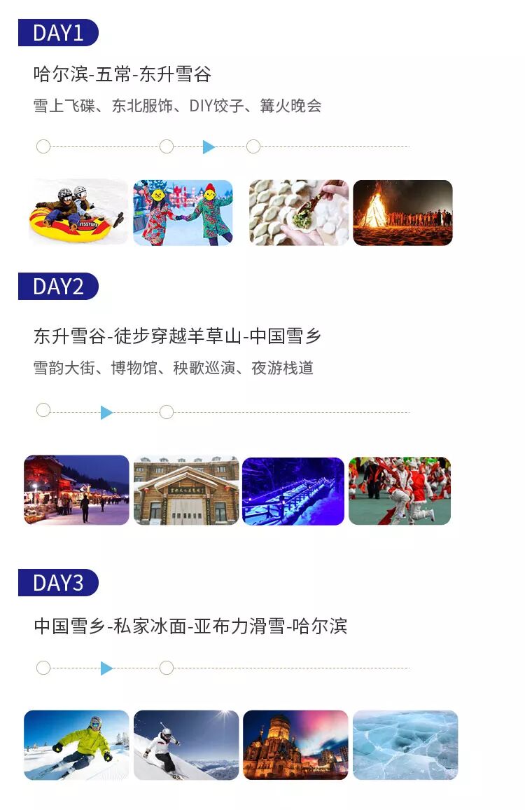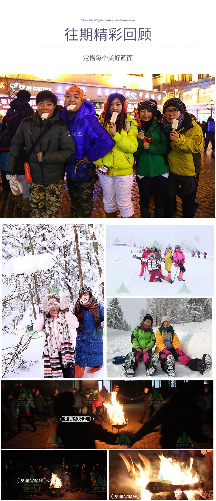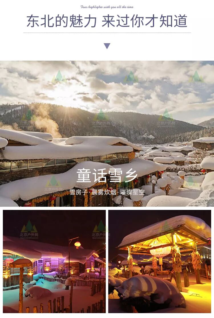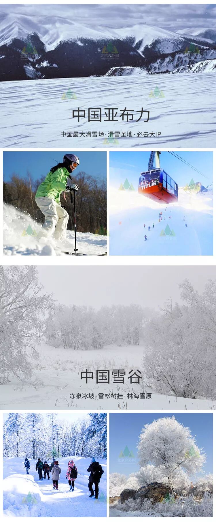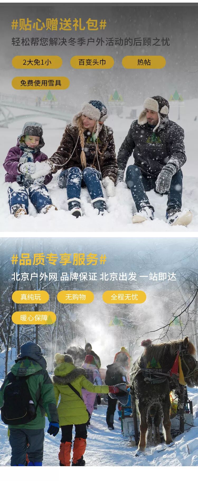 1.门 票:东升穿越门票、中国雪乡门票+环保车票、3小时亚布力滑雪票(雪板+雪鞋+雪杖)