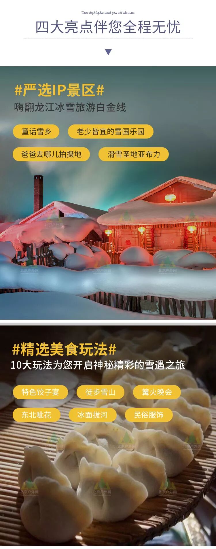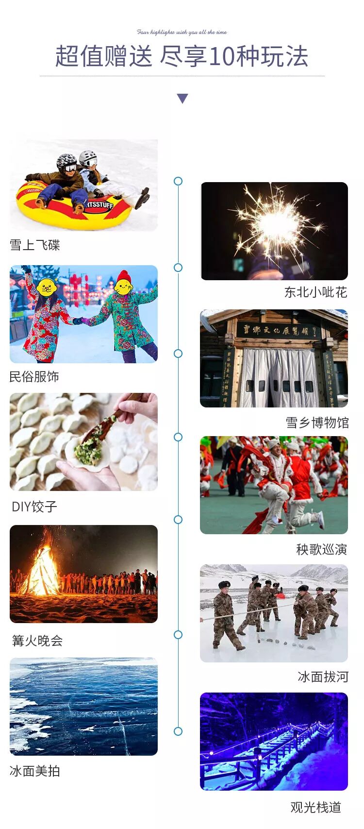 8.玩 法:赠送10种特色玩法,不参与不予以退换。【雪上飞碟】【民俗服饰】【DIY饺子】【篝火晚会】【东北小呲花】【雪乡博物馆】【秧歌巡演】【观光栈道】【冰面美拍】【冰面拔河】