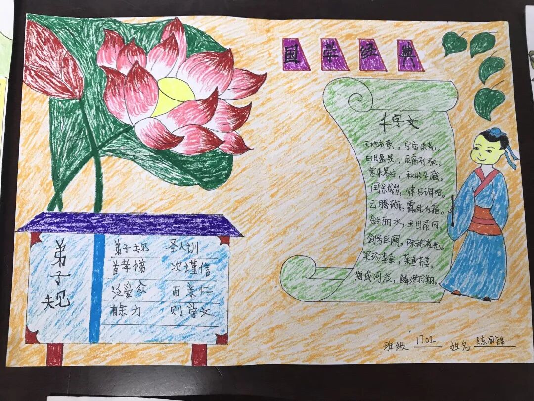 为激发学生学国学经典的热情,丰富学校《以国学经典诵读提高小学生文化底蕴的研究》课题资料,本周教学处组织“传承国学经典 弘扬民族精神”国学手抄报比赛,三至六年级每班20名学生参加比赛,通过专业评委从内容,版面,插图,整体设计等方面的综合评审,尹盛华等15位同学荣获特等奖,215人荣获一等奖。(附特等奖作品展示和获奖名单)