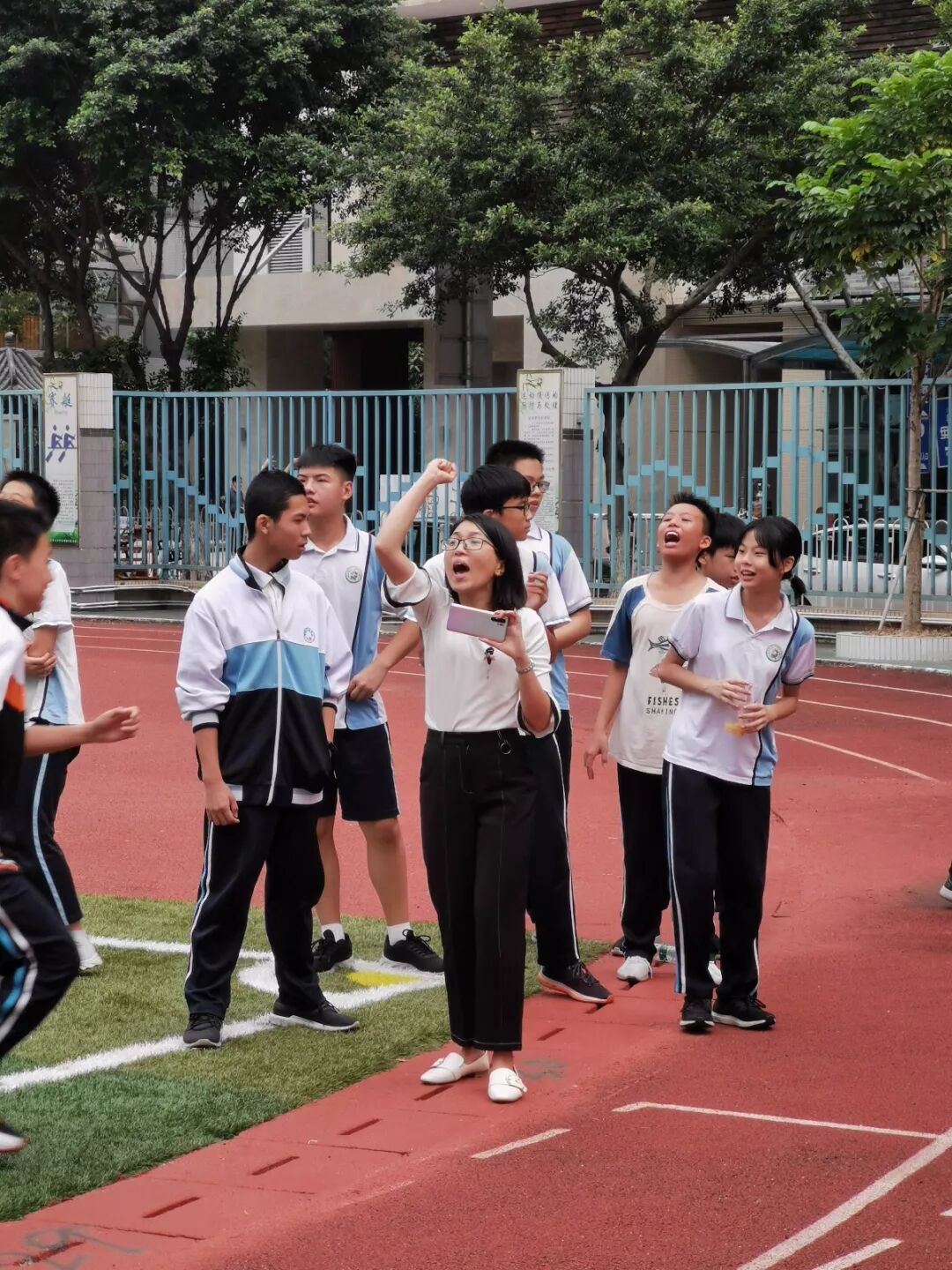 24日8点整,各班级早已环绕操场排着整齐的队伍,学子们脸庞都流露出兴奋而紧张的表情,他们身上五彩斑斓的班服在跑道上显得绚丽耀眼。