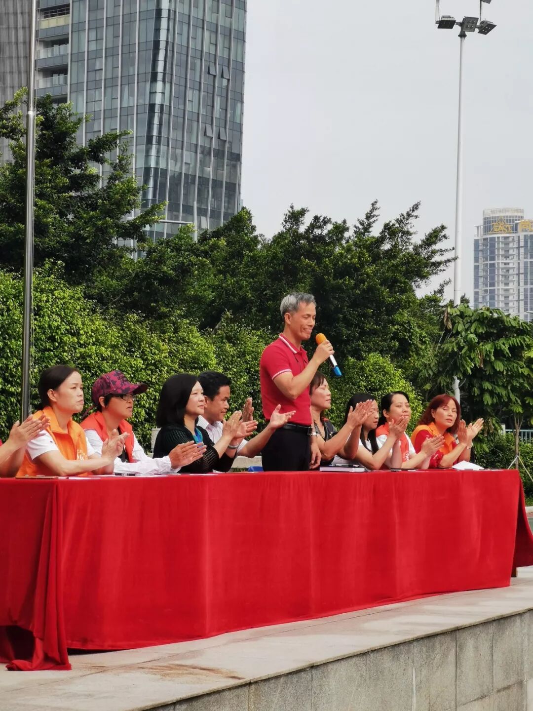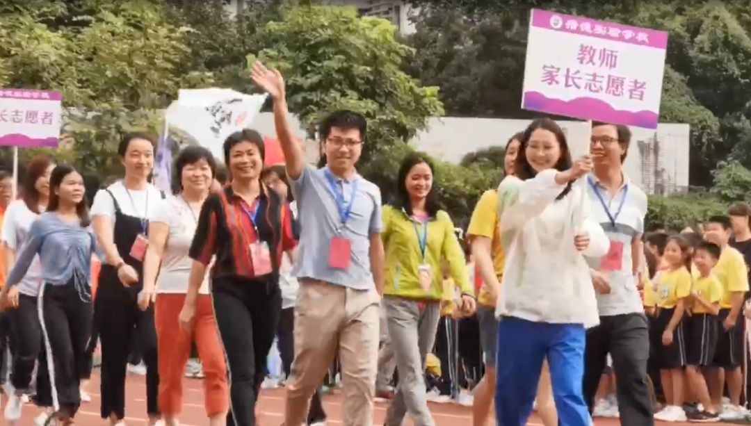 队伍的最后是教师裁判队伍和家长志愿者方队,他们以饱满的热情挥舞着双手,向观众示意。