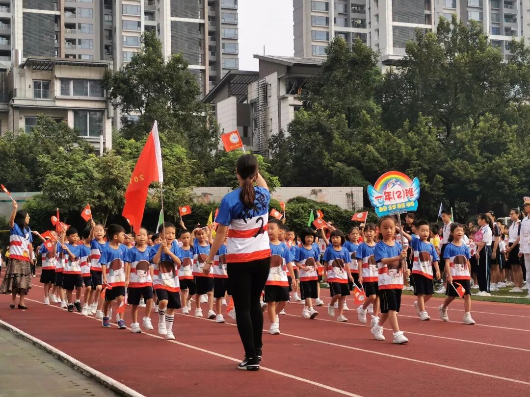 随后各班方队举着班牌,分成四列纵队从跑道喊着口号走过主席台,展现自己的班级特色风貌。他们有的如天鹅,昂首阔步;有的如矫健的雏鹰,展翅飞翔;有的以灿烂的笑容书写热情;有的高喊“做最好的自己”“体育健儿向前闯”运动口号。小学部20个班级喊着响亮的口号,整齐划一地走过了主席台。