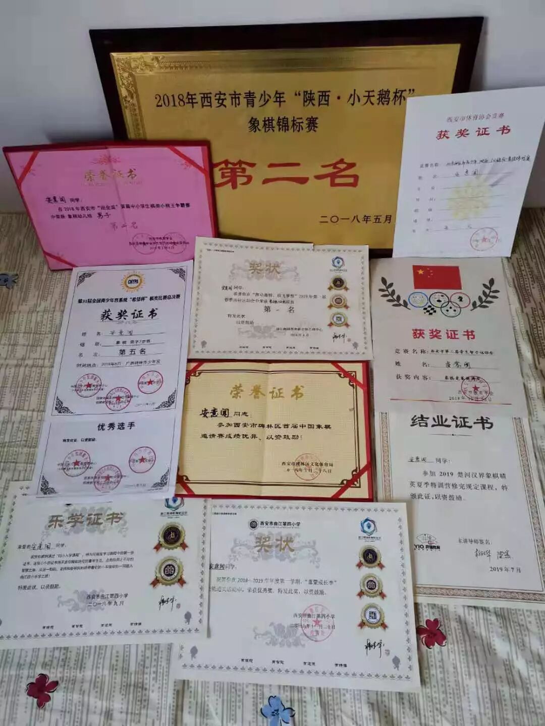 2016年9月我开始学习象棋,象棋是体育,同时也是科学和艺术。中国是文明之邦,自古以来崇尚礼仪,学棋不仅仅强调竞技,同时也培养良好的意志品质。在今后的学习中,我更愿意做象棋里面的那一个小小的卒子,虽行动缓慢,可谁曾见我后退,坚持自己最初的梦想,一步一步地努力前行。在学象棋三年的时间里,有艰辛的泪水,也有收获的喜悦。努力付出终有收获:2018年西安市“迎全运”首届中小学生棋类小棋王争霸赛幼儿组第二名。2018年8月,第31届全国青少年宫系统“希望杯”棋类比赛总决赛7岁组第五名。2018西安市青少年“陕西小天鹅杯”象棋锦标赛第二名。