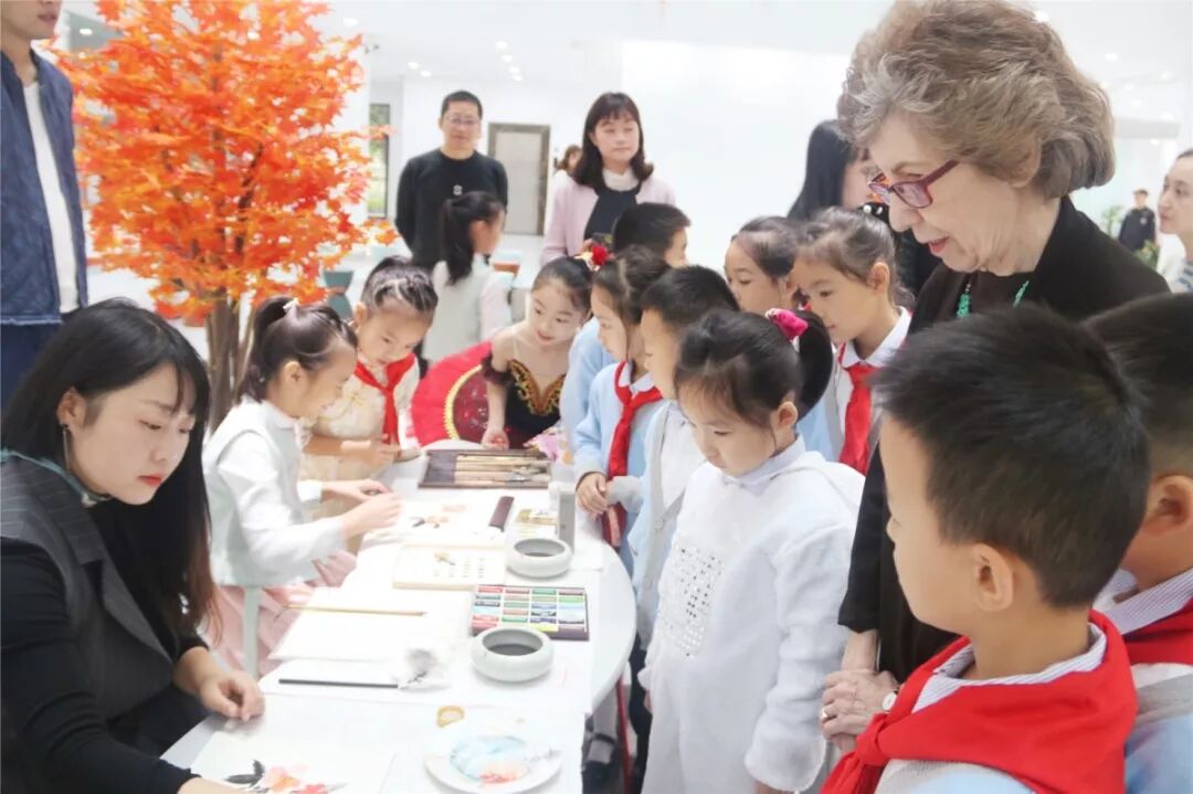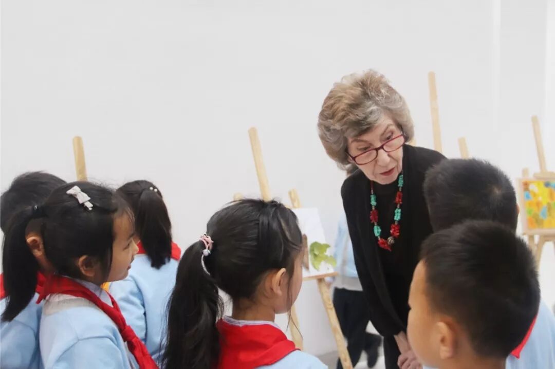 Susan一边认真听着“小导游”的介绍,一边与孩子们亲切问好。孩子们也争先恐后地介绍起自己,并向客人赠送了扇子画等艺术与表达作品。