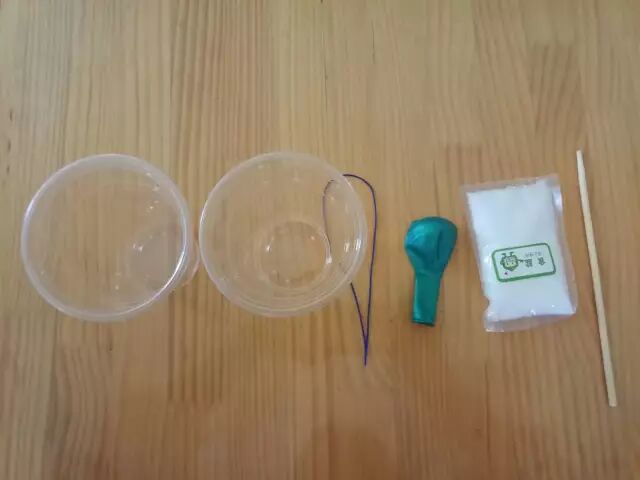 两个塑料杯、气球1个、线绳1根、食盐1袋、搅拌棒1根。