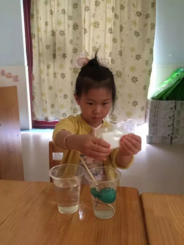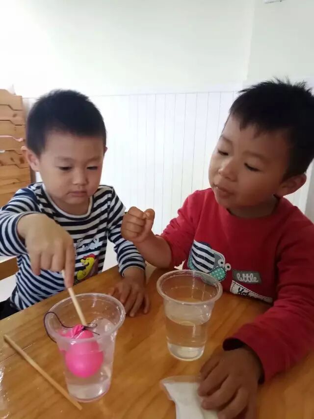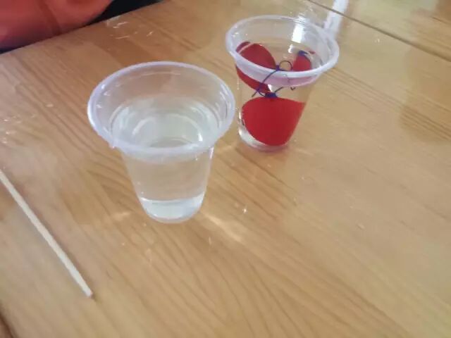 第三步,把水球放在冷水杯子里。观察水球在冷水中的变化。