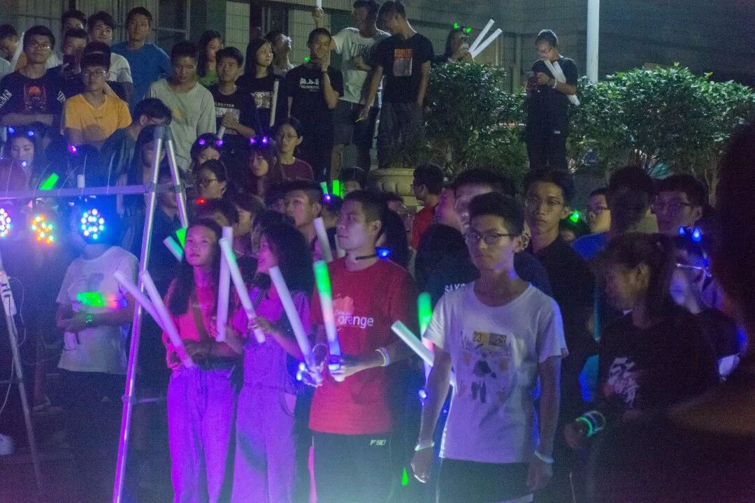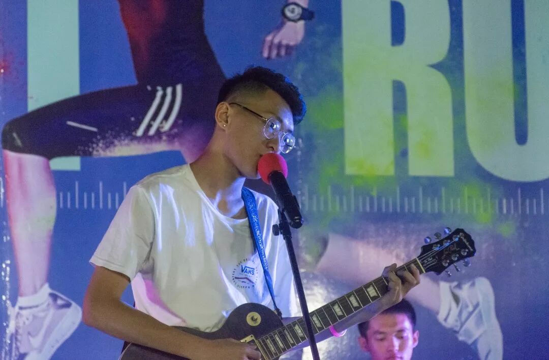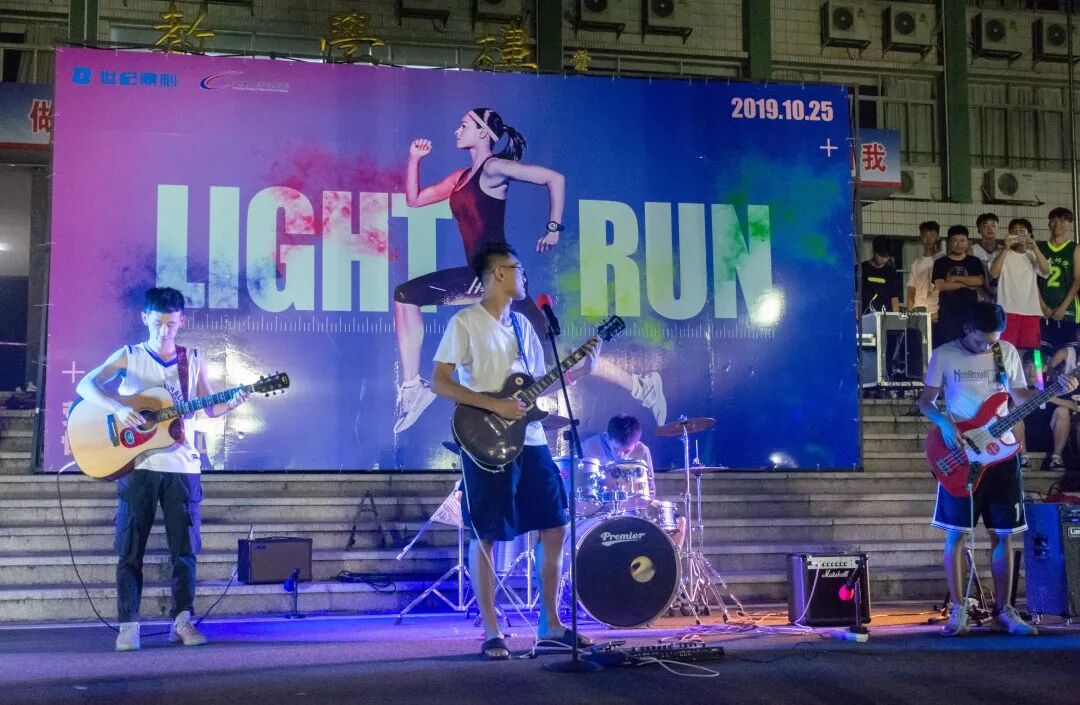 吉他手、架子鼓,霸气的台风。一首《茶底世界》,将气氛活跃到了高潮。学生的欢呼、荧光的闪绕,每一次跳跃,都彰显着学生的冲劲。