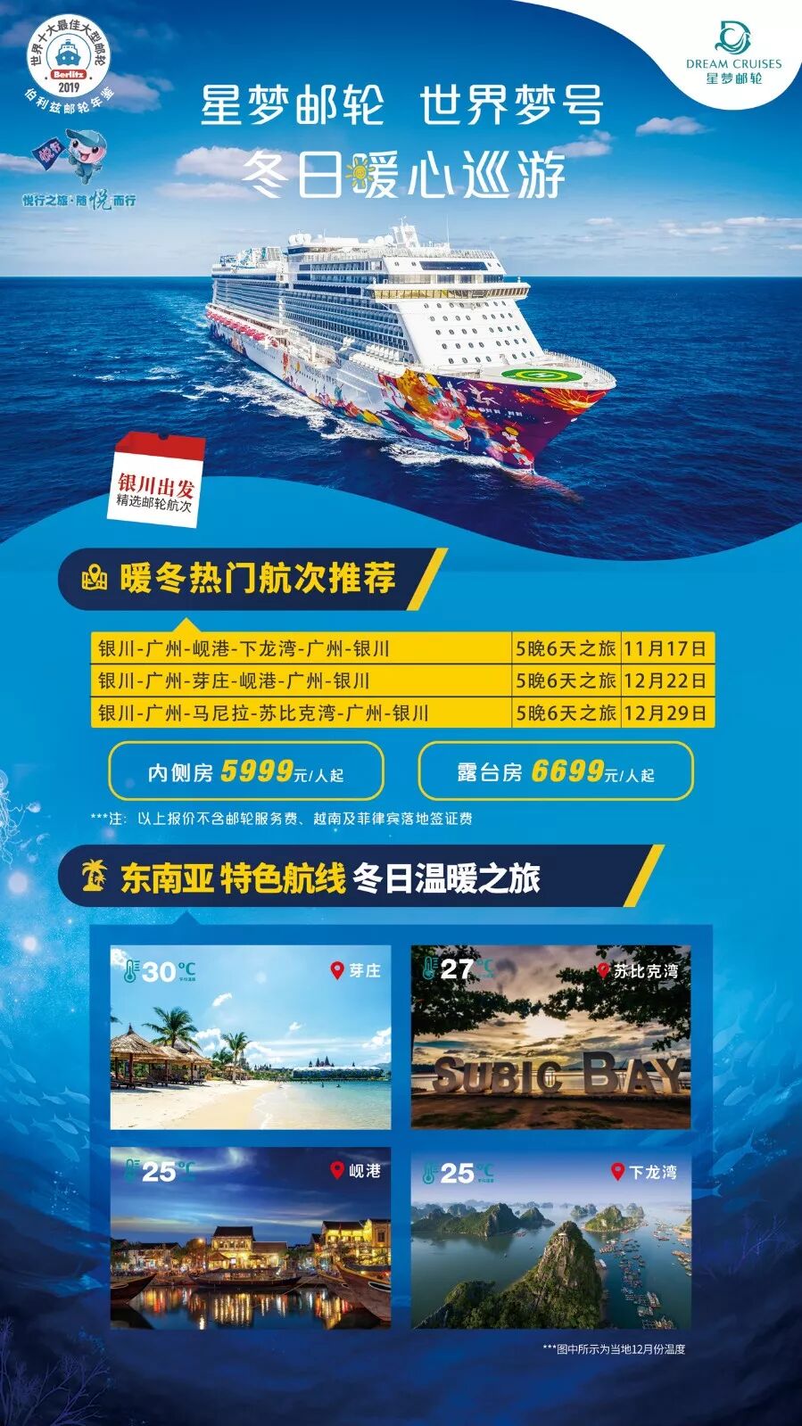 皇家加勒比游轮-【海洋光谱号】超前预售:2019年10月31日前报名,立减1000(邮轮公司给予交通补助)2020年01月13日(寒假春节前航次)银川起止,上领队银川-香港-冲绳(日本)-上海-银川 7晚8天游标准内舱2人间:7499/人(已售完)标准海景2人间:7699/人(已售完)标准海景3人间:7399/人(已售完)标准阳台2人间:8199/人(余1间)标准阳台3人间:7699/人(余2间)高级阳台2人间:8299/人(余1间)高级阳台3人间:7799/人(余1间)亮点:超凡体验,16.8万吨(亚洲最大),2019年6月6日首航,亚洲最新,设施最新,科技感十足,香港上船,上海下船,从南到北,体验春夏秋冬的温度,感受不一样的繁华。