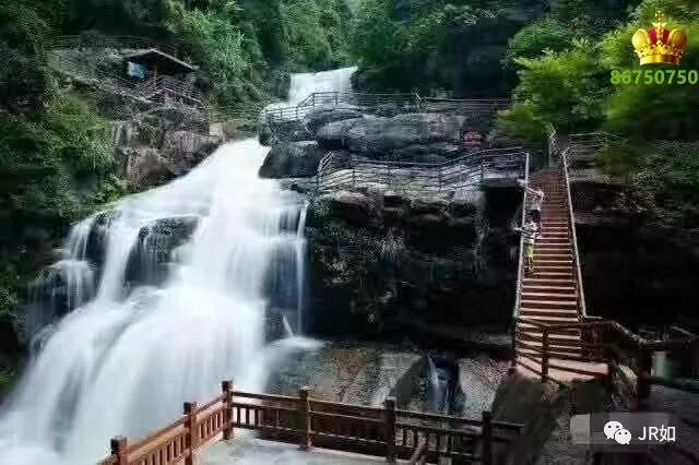 水流经50多米的落差意犹未尽,继续向前,下行约百米又形成一个银河飞瀑,落差约120米,两边岩石高起,积压得瀑布像一条玉带凌空飞舞般翩跹而下,令人叹为观止。从飞瀑断崖处远望,岩石若水洗,层叠似铁关,溪水深碧,偶尔在阳光照耀下,蜿蜒不知所踪。而在下游,还有一个三叠瀑布,水流在三个落差各6米的断崖处唱阳关三叠。