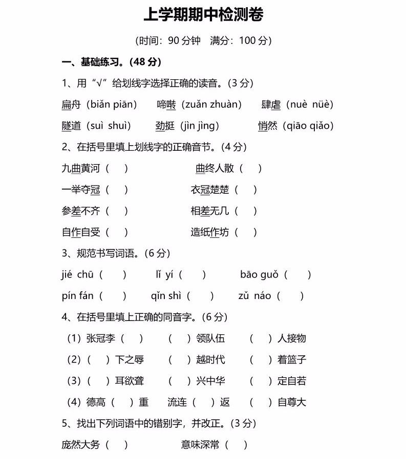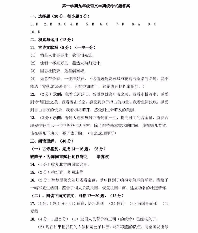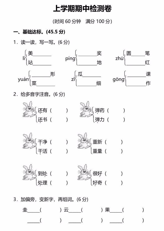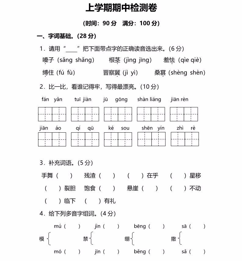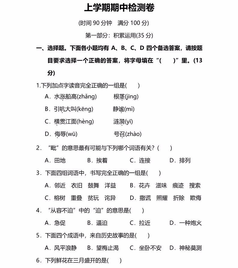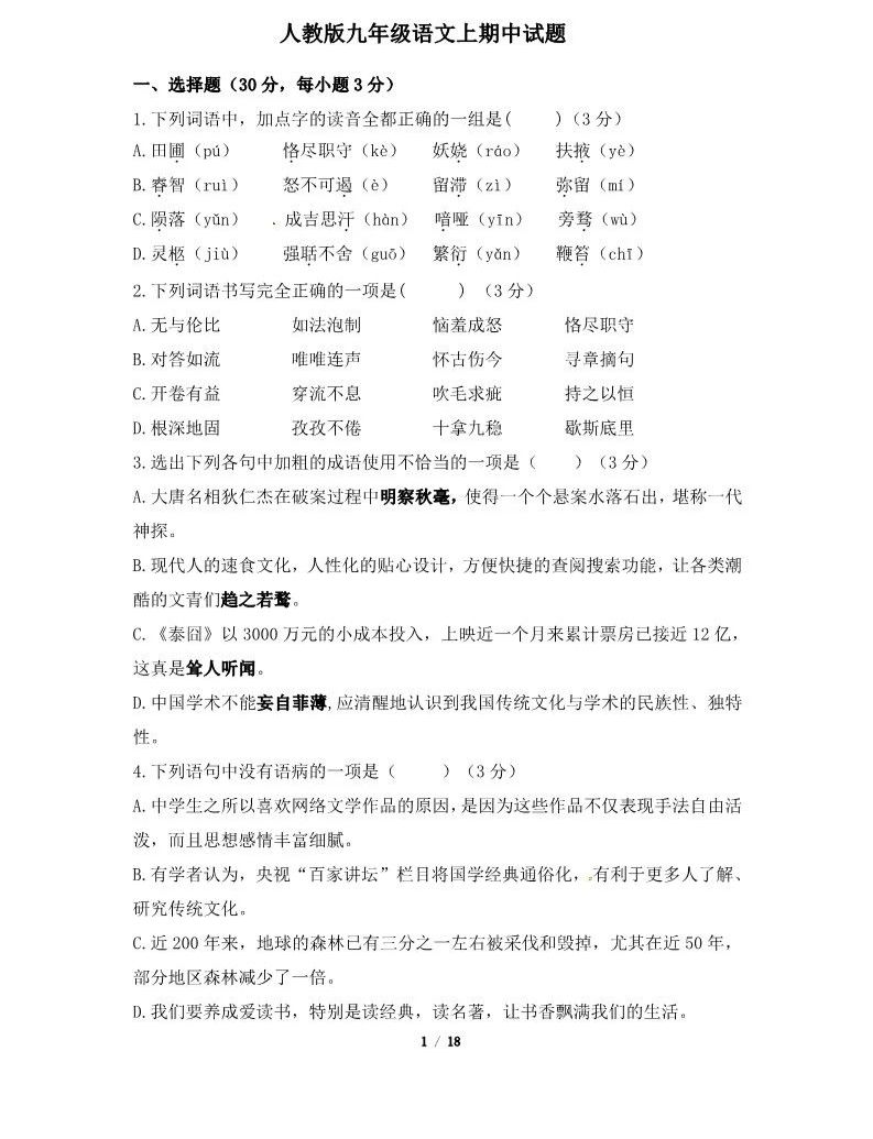 1-9年级语文上册期中过关检测卷一(附答案)可下载