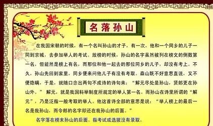 吴人孙山,滑稽才子也。赴举他郡,乡人托以子偕往。乡人子失意,山缀榜末,先归。乡人问其子得失,山曰:“解名尽处是孙山,贤郎更在孙山外。”