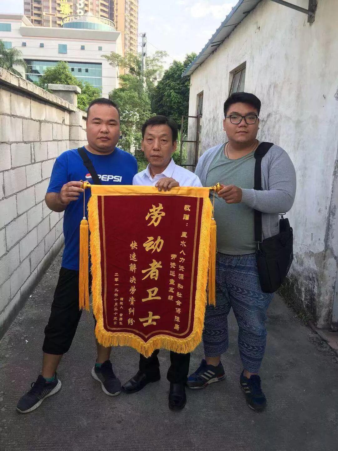 2019年10月23日,我司人社项目第五组劳资巡查人员杜嘉治、邓国浩,在处理一综日常劳动争议调解的纠纷中,巡查队员凭着专业培训的调解技巧,速成企业与工人之间的劳资纠纷调解成功,得到工人黄腾飞赞许并赠予锦旗答谢。