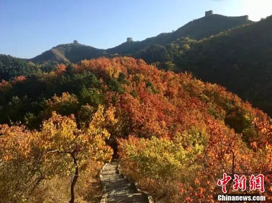 近日,位于京郊的金山岭长城秋景正浓,层林尽染,五色纷披,灿若图绣。